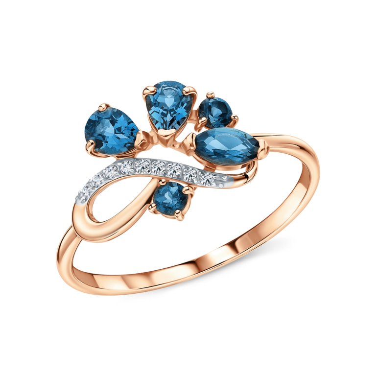 Кольцо с 9 бриллиантами природными, 0.03 карат, огранка круг 17 граней, цвет 2, чистота 2, тип огранки А; 2 топазами лондон природными, 0.335 карат, тип огранки Б; 1 топазом лондон природным, 0.164 карат, тип огранки Б; 2 топазами лондон природными, 0.114 карат, тип огранки В; Розовое золото 585 пробы.