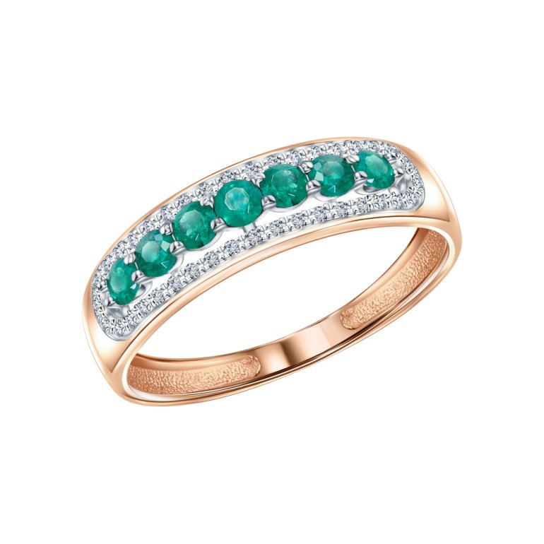 Кольцо с 7 изумрудами природными, 0.391 карат, цвет 3, чистота 3, тип огранки В; 38 бриллиантами, 0.098 карат, огранка круг 17 граней, цвет 2, чистота 2, тип огранки Б; Розовое золото 585 пробы.