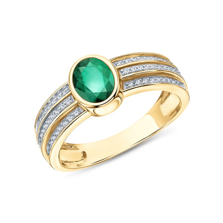 Кольцо с 62 бриллиантами природными, 0.157 карат, огранка круг 17 граней, цвет 2, чистота 2, тип огранки А; 1 изумрудом природным, 0.645 карат, цвет 4, чистота 3, тип огранки Б; Желтое золото 585 пробы.