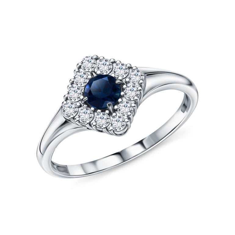 Кольцо с 1 сапфиром природным, 0.262 карат, цвет 2, чистота 2, тип огранки В; 12 бриллиантами, 0.266 карат, огранка круг 57 граней, цвет 3, чистота 6, тип огранки А; Белое золото 585 пробы.