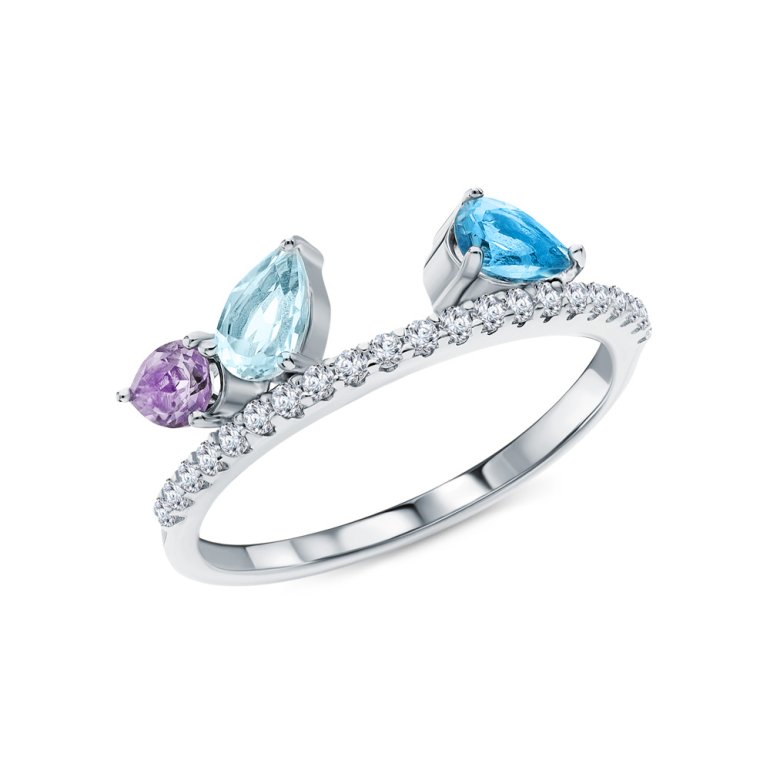 Кольцо с 1 топазом скай природным, 0.235 карат; 1 топазом свисс природным, 0.22 карат; 1 аметистом природным, 0.145 карат;  фианитом бесцветным; Серебро 925 пробы.