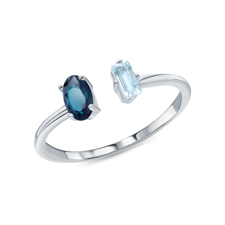 Кольцо с 1 топазом лондон природным, 0.29 карат; 1 топазом скай природным, 0.158 карат; Серебро 925 пробы.