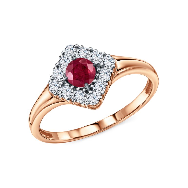 Кольцо с 1 рубином природным, 0.308 карат, цвет 2, чистота 2, тип огранки В; 12 бриллиантами, 0.271 карат, огранка круг 57 граней, цвет 3, чистота 6, тип огранки А; Розовое золото 585 пробы.