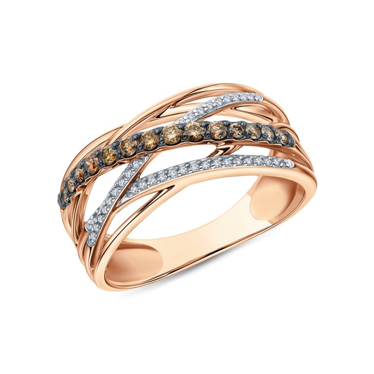 Кольцо с 36 бриллиантами природными, 0.065 карат, огранка круг 17 граней, цвет 2, чистота 2, тип огранки А; 7 бриллиантами коньячными природными, 0.147 карат, огранка круг 57 граней, цвет 7, чистота 5, тип огранки А; 7 бриллиантами коньячными природными, 0.094 карат, огранка круг 57 граней, цвет 7, чистота 5, тип огранки А; Розовое золото 585 пробы.