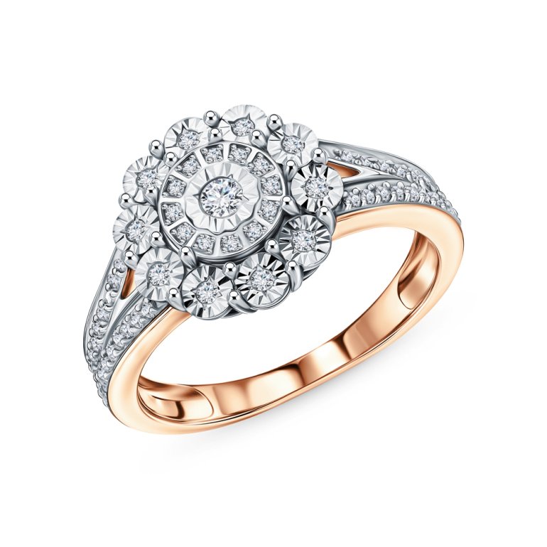 Кольцо с 1 бриллиантом природным, 0.042 карат, огранка круг 57 граней, цвет 4, чистота 6, тип огранки А; 10 бриллиантами природными, 0.048 карат, огранка круг 17 граней, цвет 2, чистота 2, тип огранки Б; 36 бриллиантами природными, 0.151 карат, огранка круг 17 граней, цвет 2, чистота 2, тип огранки А; 12 бриллиантами природными, 0.043 карат, огранка круг 17 граней, цвет 2, чистота 2, тип огранки А; Розовое и белое золото 585 пробы.