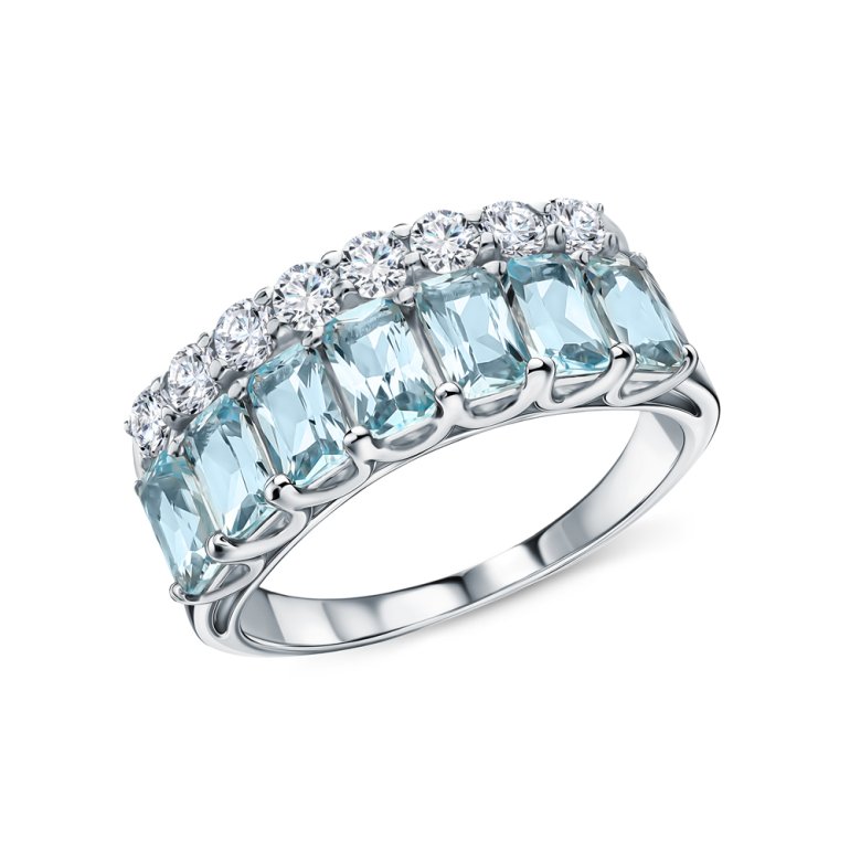 Кольцо с 7 топазами скай природными, 2.1 карат, тип огранки Б; фианитом бесцветным; Серебро 925 пробы.