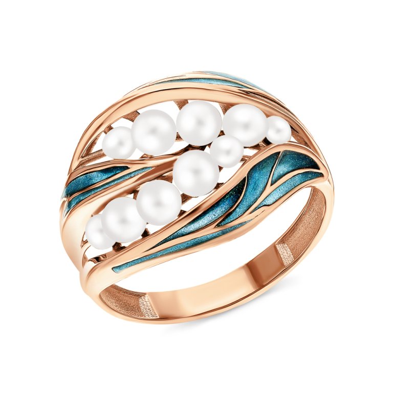 Кольцо с 6 жемчугами культивированными белыми, 1.576 карат, тип огранки Б;4 жемчугами культивированными белыми, 0.422 карат, тип огранки Б; эмаль зеленая; Розовое золото 585 пробы.