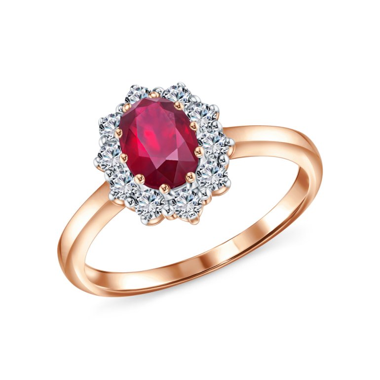 Кольцо с 1 рубином, 0.861 карат, цвет 2, чистота 3, тип огранки Б; 10 бриллиантами, 0.358 карат, огранка круг 57 граней, цвет 3, чистота 6, тип огранки А; Розовое золото 585 пробы.