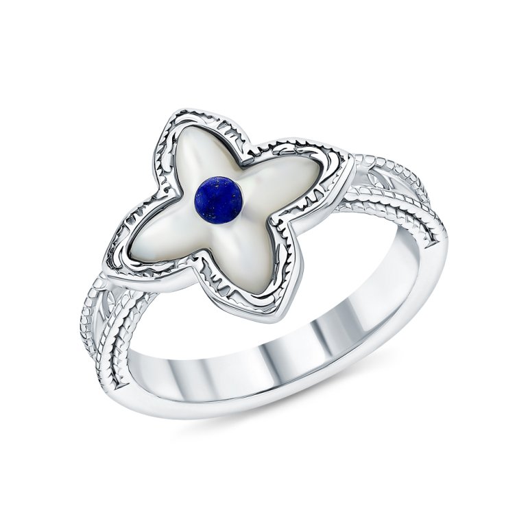 Кольцо с фианитом бесцветным; 1 перламутром белым природным; 1 лазуритом; Серебро 925 пробы.