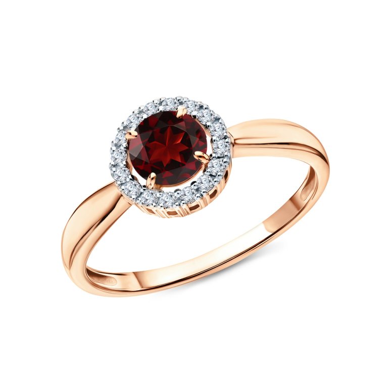 Кольцо с 1 гранатом природным, 0.589 карат, тип огранки В; 16 бриллиантами, 0.103 карат, огранка круг 17 граней, цвет 2, чистота 2, тип огранки А; Розовое золото 585 пробы.