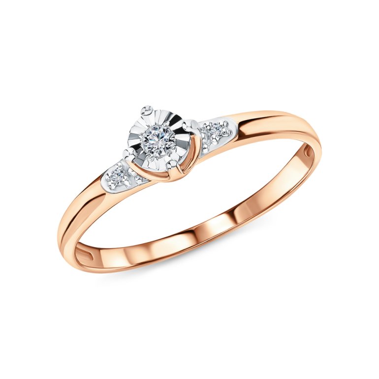 Кольцо с 1 бриллиантом природным, 0.034 карат, огранка круг 57 граней, цвет 3, чистота 6, тип огранки А; 2 бриллиантами природными, 0.008 карат, огранка круг 17 граней, цвет 2, чистота 2, тип огранки А; Розовое и белое золото 585 пробы.
