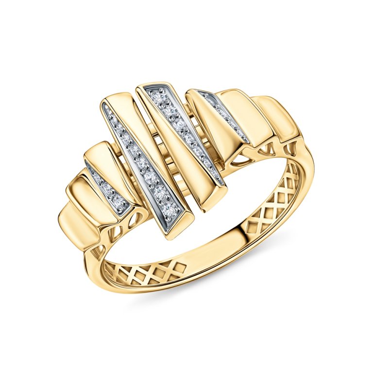 Кольцо с 10 бриллиантами, 0.073 карат, огранка круг 57 граней, цвет 3, чистота 6, тип огранки А; 13 бриллиантами, 0.046 карат, огранка круг 57 граней, цвет 3, чистота 6, тип огранки А; Желтое золото 585 пробы.