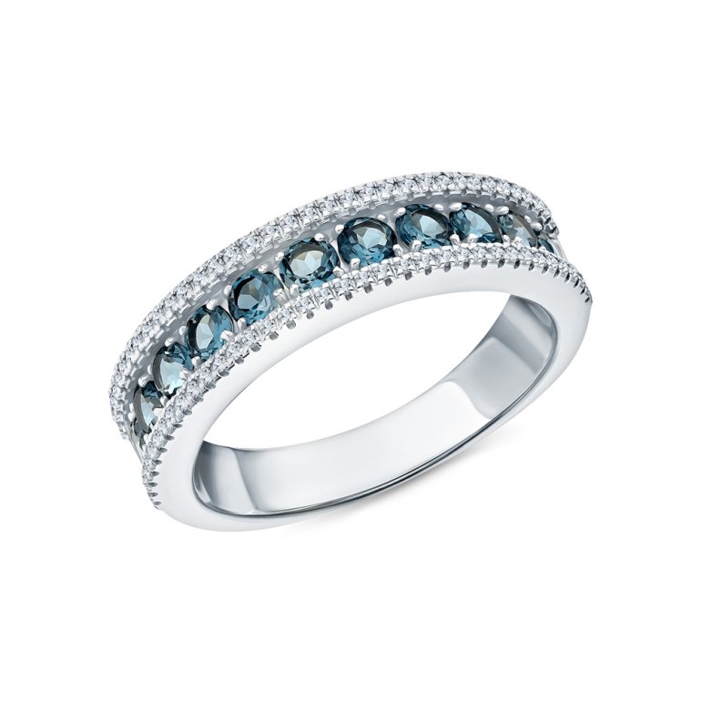 Кольцо с 70 бриллиантами природными, 0.174 карат, огранка круг 17 граней, цвет 2, чистота 2, тип огранки А; 11 топазами лондон природными, 1.396 карат, тип огранки В; Белое золото 585 пробы.