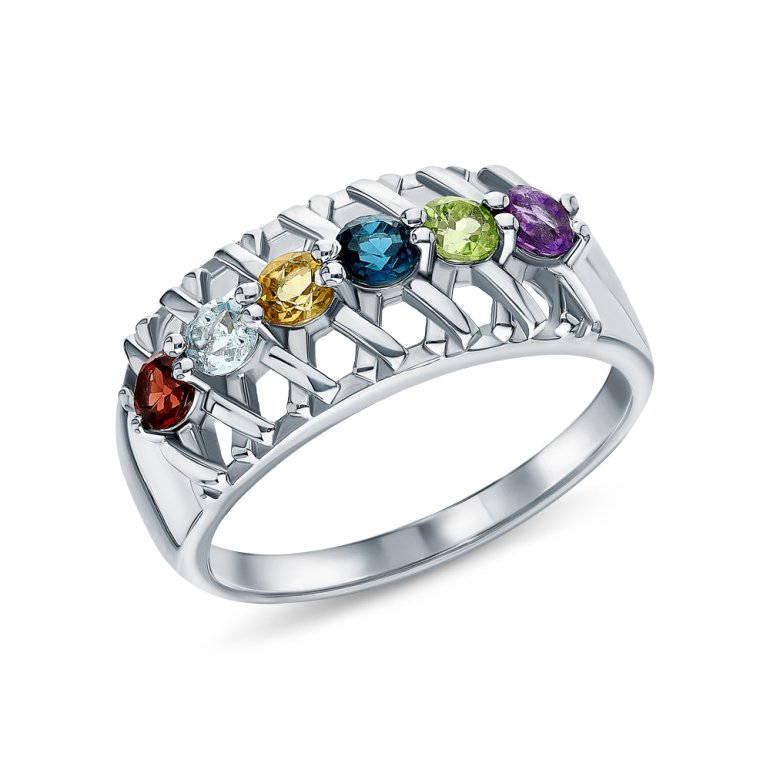 Кольцо с 1 гранатом природным, 0.1 карат; 1 цитрином природным, 0.1 карат; 1 топазом лондон природным, 0.1 карат; 1 хризолитом природным, 0.1 карат; 1 аметистом природным, 0.1 карат; 1 топазом скай природным, 0.1 карат; Серебро 925 пробы.