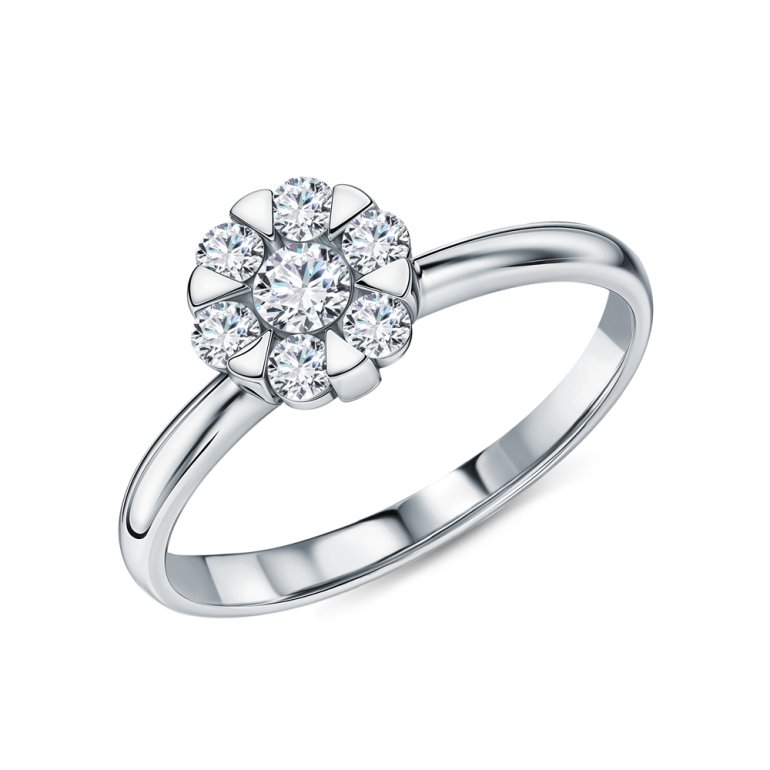 Кольцо с 1 бриллиантом выращенным, 0.193 карат, огранка круг 57 граней, цвет 3, чистота 6, тип огранки А; 6 бриллиантами выращенными, 0.28 карат, огранка круг 57 граней, цвет 3, чистота 6, тип огранки А; Белое золото 585 пробы.