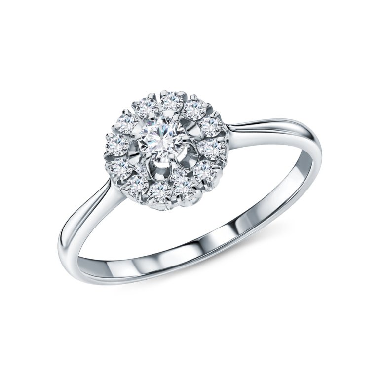 Кольцо с 1 бриллиантом выращенным, 0.165 карат, огранка круг 57 граней, цвет 3, чистота 6, тип огранки А; 12 бриллиантами выращенными, 0.206 карат, огранка круг 57 граней, цвет 3, чистота 6, тип огранки А; Белое золото 585 пробы.