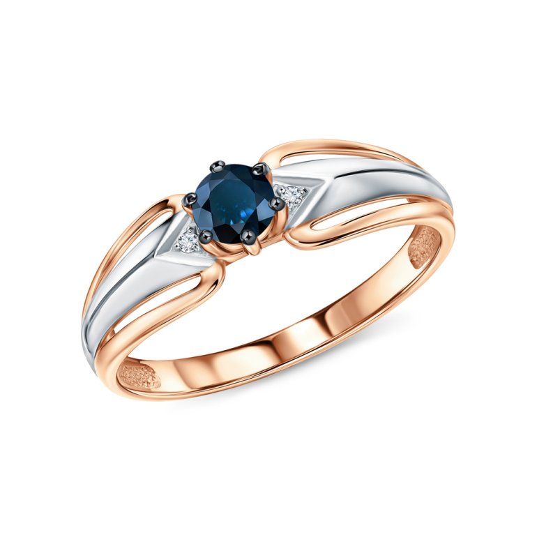 Кольцо с 2 бриллиантами природными, 0.009 карат, огранка круг 57 граней, цвет 4, чистота 6, тип огранки А; 1 сапфиром природным, 0.264 карат, цвет 2, чистота 2, тип огранки В; Розовое золото 585 пробы.