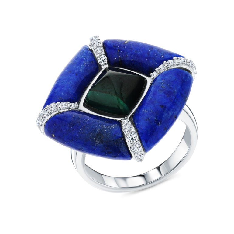 Серебряное кольцо с лазуритом, фианитами и малахитом