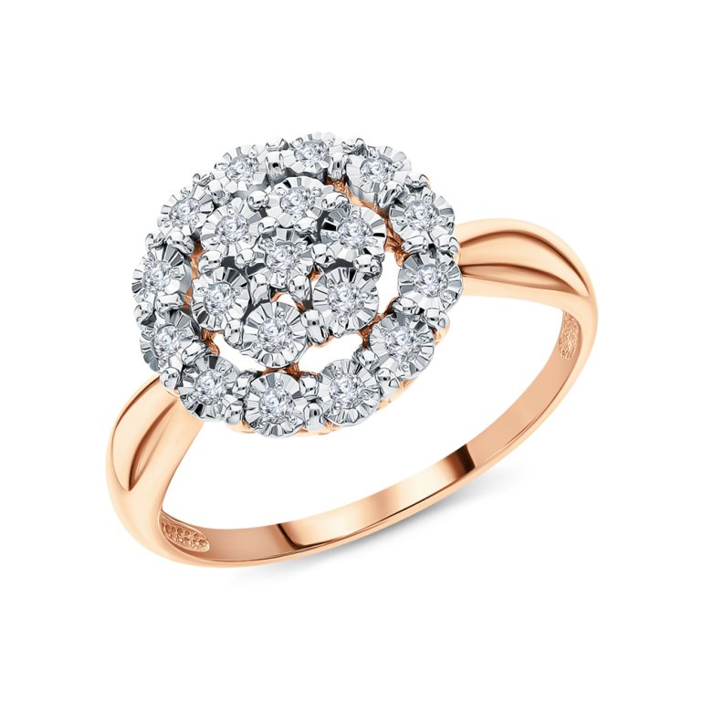Кольцо с 19 бриллиантами природными, 0.16 карат, огранка круг 57 граней, цвет 3, чистота 6, тип огранки А; Розовое и белое золото 585 пробы.