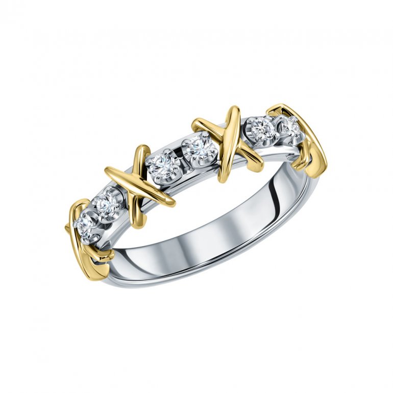 Кольцо с 6 бриллиантами природными, 0.179 карат, огранка круг 57 граней, цвет 3, чистота 6, тип огранки А; Желтое и белое золото 585 пробы.