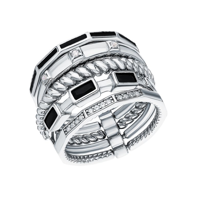 Кольцо, вставка: фианитом бесцветным;  черным фианитом;  эмаль черная; Серебро 925 пробы.
