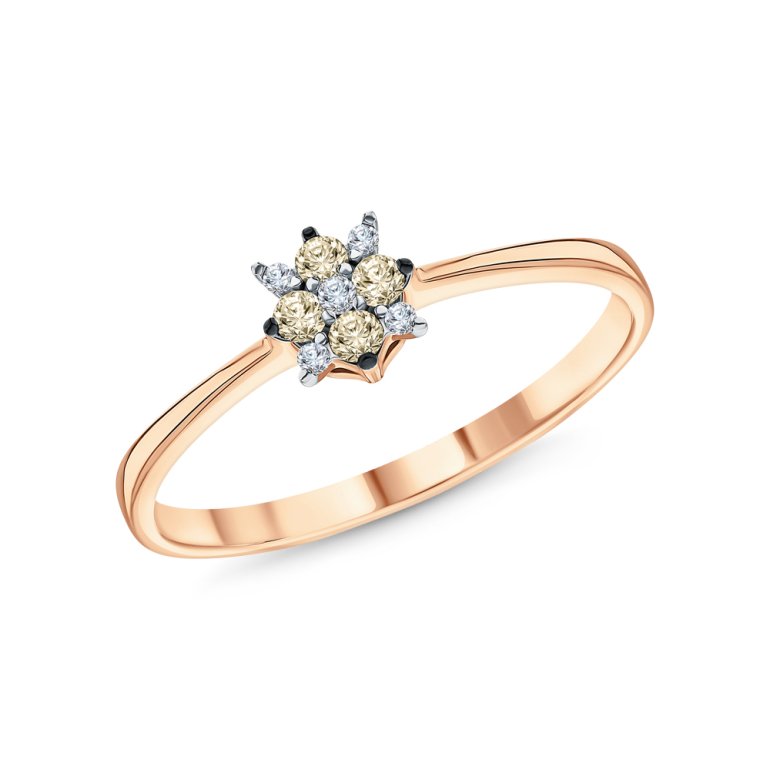 Кольцо с 1 бриллиантом природным, 0.008 карат, огранка круг 57 граней, цвет 4, чистота 4, тип огранки А; 4 бриллиантами природными, 0.019 карат, огранка круг 17 граней, цвет 2, чистота 2, тип огранки А; 4 бриллиантами коньячными природными, 0.091 карат, огранка круг 57 граней, цвет 7, чистота 5, тип огранки А; Розовое золото 585 пробы.
