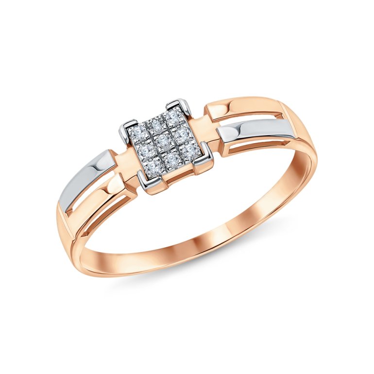 Кольцо с 9 бриллиантами, 0.063 карат, огранка круг 57 граней, цвет 3, чистота 6, тип огранки А; Розовое и белое золото 585 пробы.