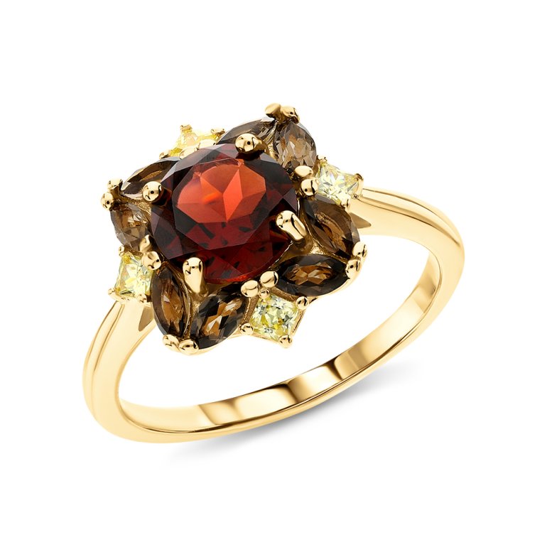 Кольцо с 1 гранатом природным, 1.6 карат; 8 кварцами дымчатыми природными, 0.8 карат;  фианит жёлтый; Серебро 925 пробы.