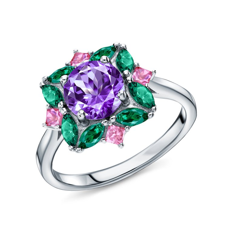 Кольцо с 1 аметистом природным, 1.3 карат;  фианит зеленый;  фианит розовый; Серебро 925 пробы.