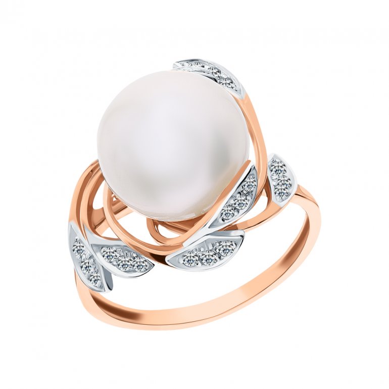 Кольцо с фианитами;1 жемчугом культивированным белым; Розовое золото 585 пробы.