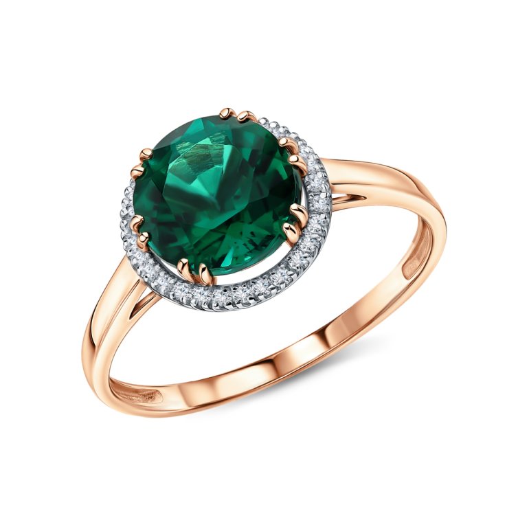 Кольцо с 1 гидротермальным изумрудом, 1.758 карат, тип огранки В; 28 бриллиантами, 0.086 карат, огранка круг 17 граней, цвет 2, чистота 2, тип огранки Б; Розовое золото 585 пробы.