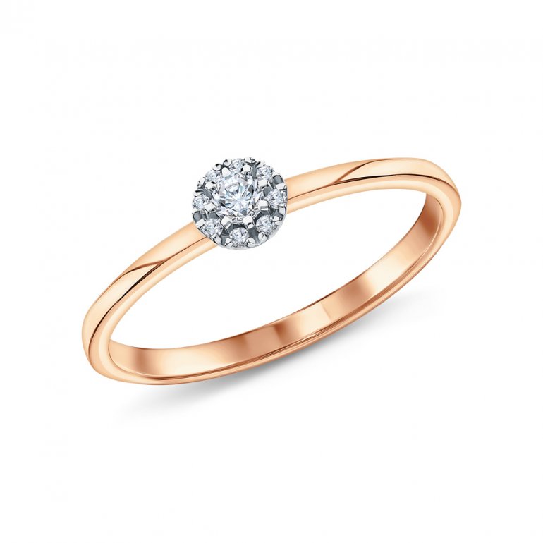 Кольцо с 1 бриллиантом, 0.078 карат, огранка круг 57 граней, цвет 3, чистота 6, тип огранки А; 8 бриллиантами, 0.029 карат, огранка круг 17 граней, цвет 2, чистота 2, тип огранки А; Розовое золото 585 пробы.