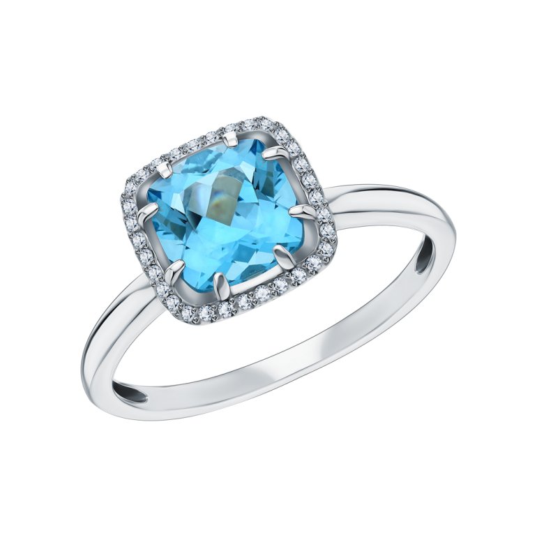 Кольцо с 1 топазом свисс, 1.839 карат, тип огранки Б; 32 бриллиантами, 0.068 карат, огранка круг 17 граней, цвет 2, чистота 2, тип огранки Б; Белое золото 585 пробы.