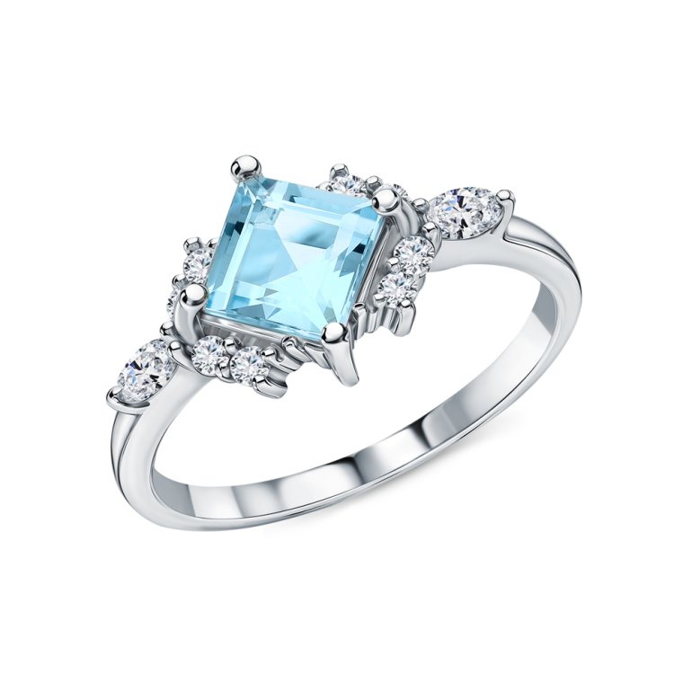 Кольцо с 1 топазом скай природным, 1.48 карат;  фианитом бесцветным; Серебро 925 пробы.