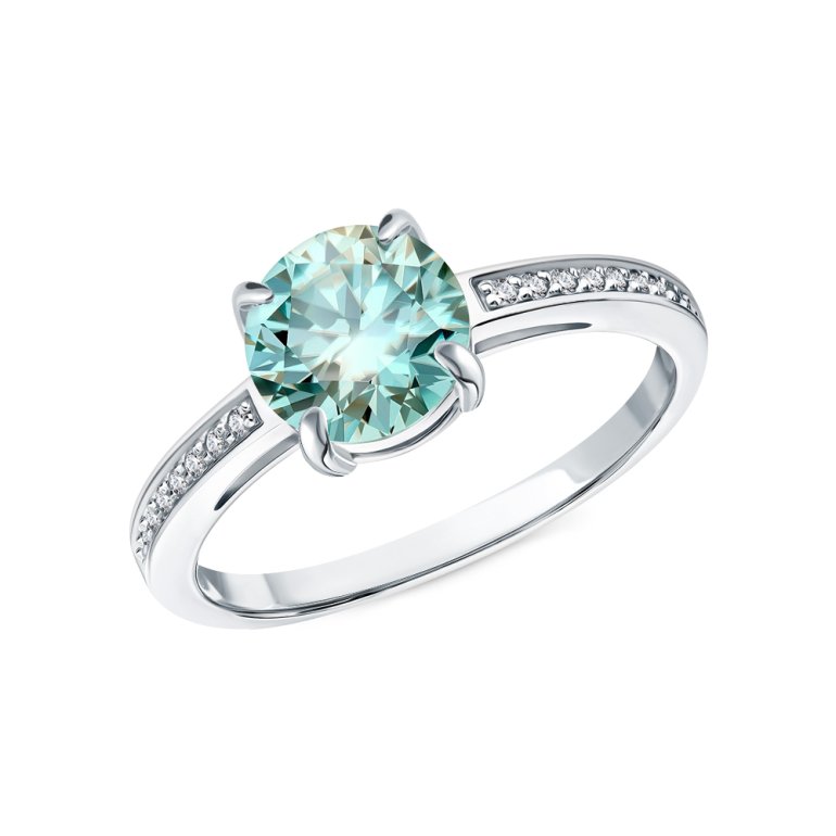 Кольцо с 1 муассанитом параиба, 1.802 карат, тип огранки В; фианитом бесцветным; Серебро 925 пробы.