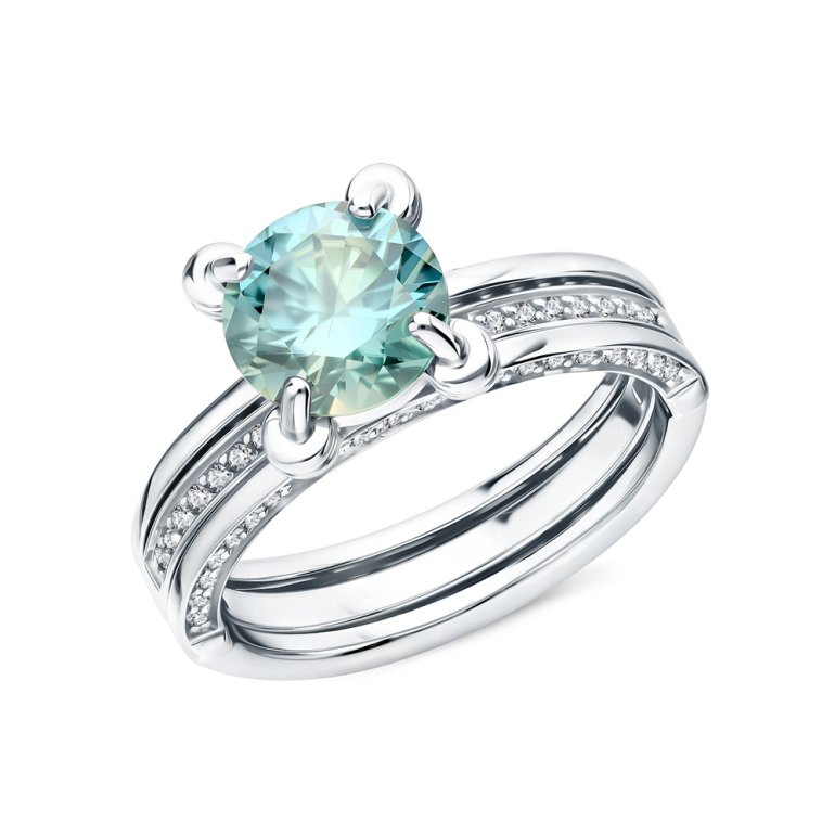 Кольцо с 1 муассанитом параиба, 1.802 карат, тип огранки В; фианитом бесцветным; Серебро 925 пробы.