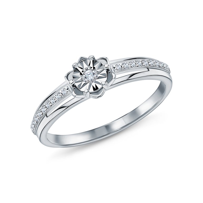 Кольцо с 1 бриллиантом природным, 0.018 карат, огранка круг 57 граней, цвет 4, чистота 6, тип огранки А; 20 бриллиантами природными, 0.041 карат, огранка круг 17 граней, цвет 2, чистота 2, тип огранки А; Белое золото 585 пробы.