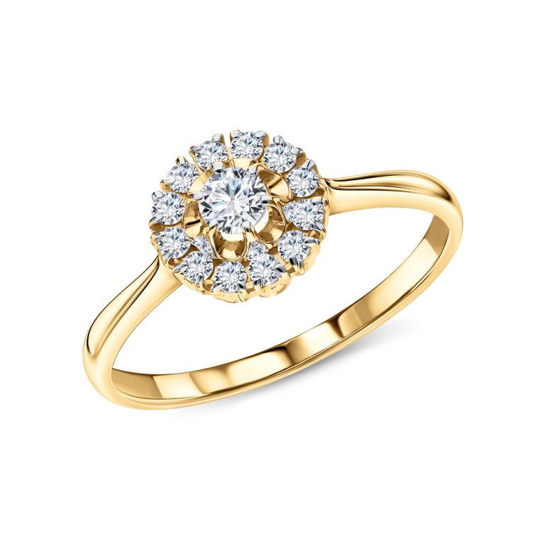 Кольцо с 1 бриллиантом выращенным, 0.165 карат, огранка круг 57 граней, цвет 3, чистота 6, тип огранки А; 12 бриллиантами выращенными, 0.206 карат, огранка круг 57 граней, цвет 3, чистота 6, тип огранки А; Желтое золото 585 пробы.
