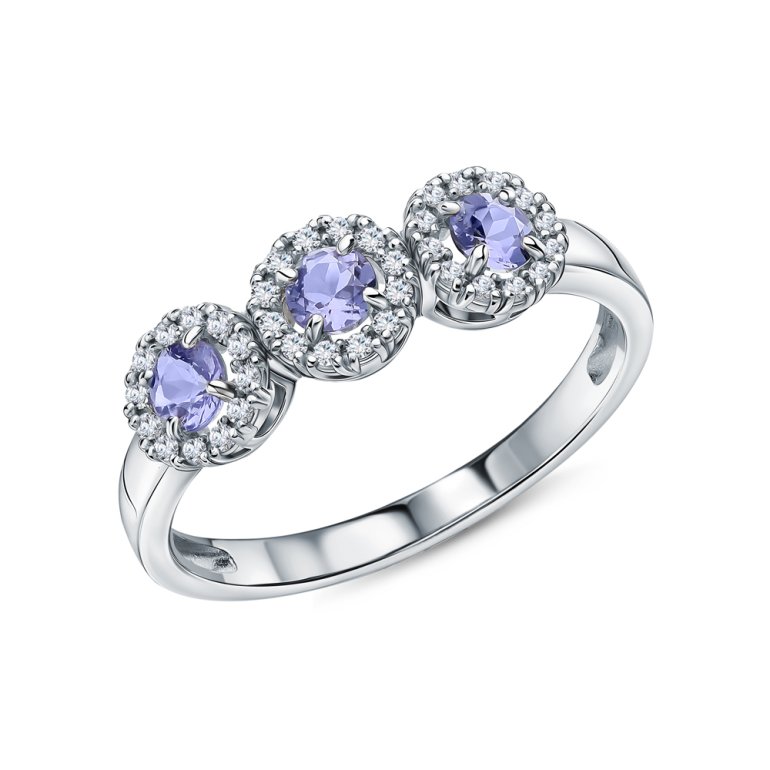 Кольцо с 3 танзанитами природными, 0.387 карат, тип огранки В; 36 бриллиантами, 0.124 карат, огранка круг 17 граней, цвет 2, чистота 2, тип огранки А; Белое золото 585 пробы.