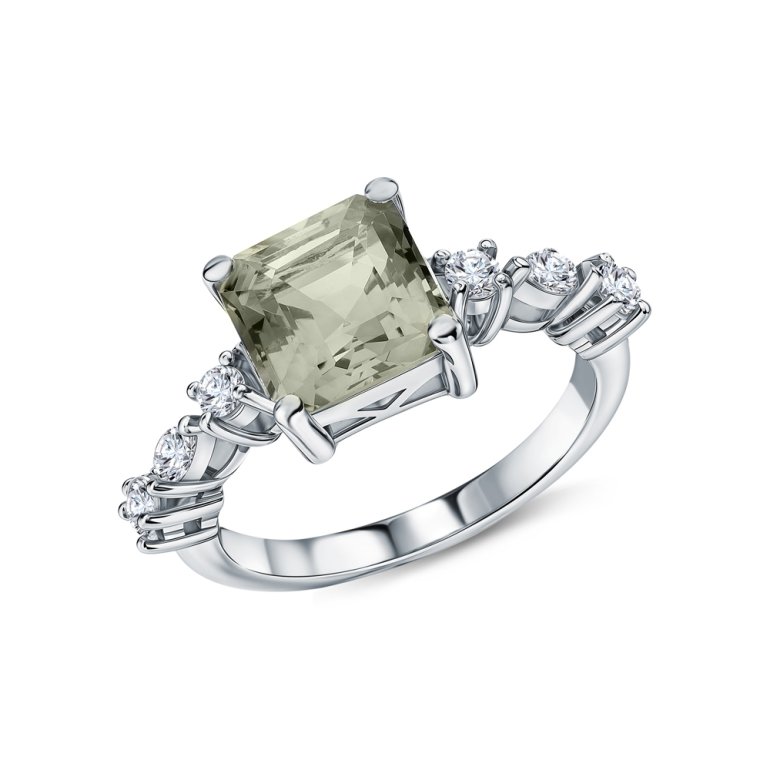 Кольцо с 1 аметистом зеленым, 2.36 карат;  фианитом бесцветным; Серебро 925 пробы.