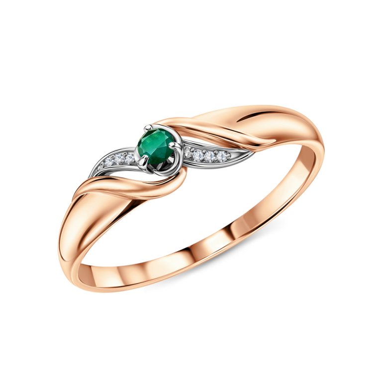 Кольцо с 1 изумрудом, 0.057 карат, цвет 3, чистота 3, тип огранки В; 4 бриллиантами, 0.009 карат, огранка круг 17 граней, цвет 2, чистота 2, тип огранки А; 2 бриллиантами, 0.004 карат, огранка круг 17 граней, цвет 2, чистота 2, тип огранки А; Розовое и белое золото 585 пробы.