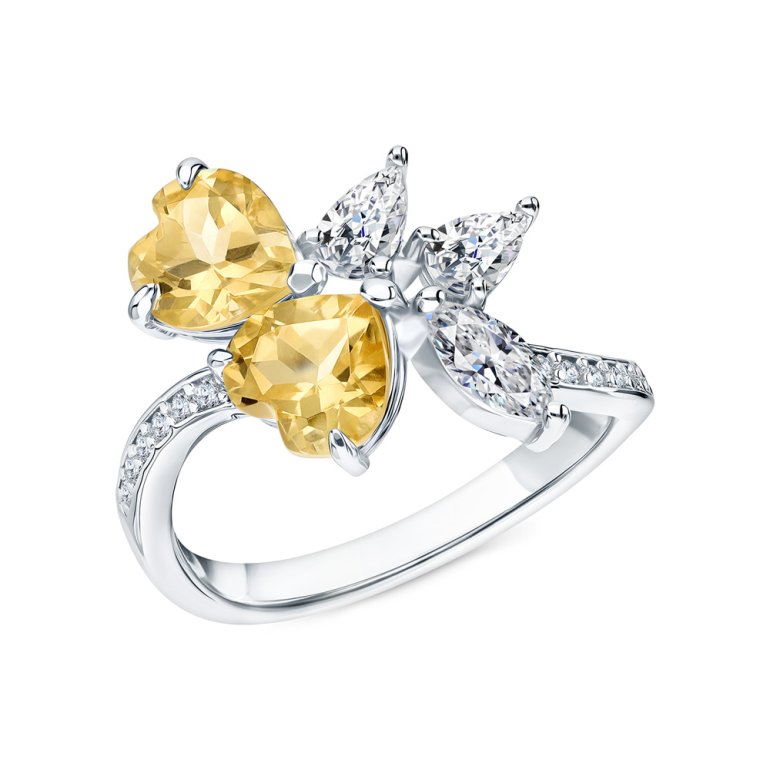 Кольцо с 2 цитринами природными; фианитом бесцветным; Серебро 925 пробы.