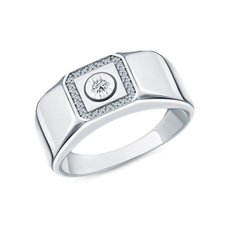 Кольцо с 1 бриллиантом природным, 0.03 карат, огранка круг 57 граней, цвет 3, чистота 6, тип огранки А; 24 бриллиантами природными, 0.071 карат, огранка круг 17 граней, цвет 2, чистота 2, тип огранки А; Белое золото 585 пробы.