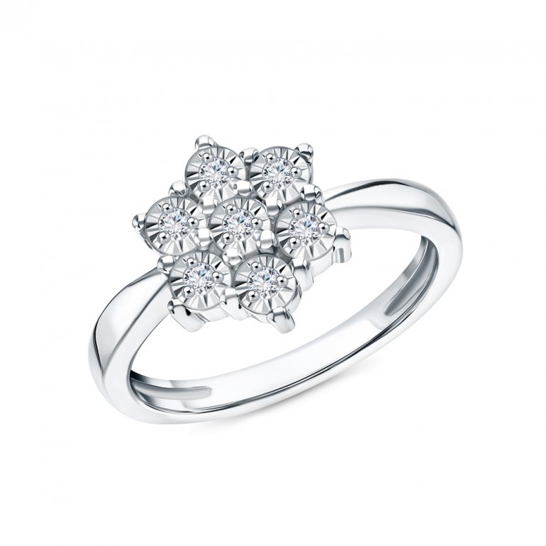 Кольцо с 7 бриллиантами природными, 0.042 карат, огранка круг 17 граней, цвет 2, чистота 4, тип огранки Б; Серебро 925 пробы.
