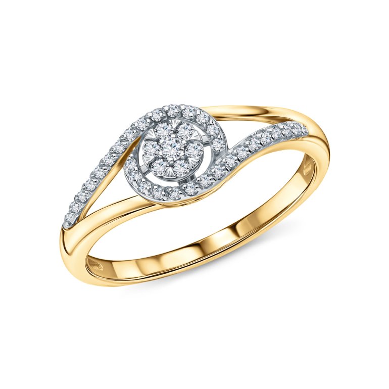 Кольцо с 1 бриллиантом, 0.015 карат, огранка круг 57 граней, цвет 3, чистота 6, тип огранки А; 6 бриллиантами, 0.043 карат, огранка круг 57 граней, цвет 3, чистота 6, тип огранки А; 30 бриллиантами, 0.076 карат, огранка круг 17 граней, цвет 2, чистота 2, тип огранки А; Желтое и белое золото 585 пробы.