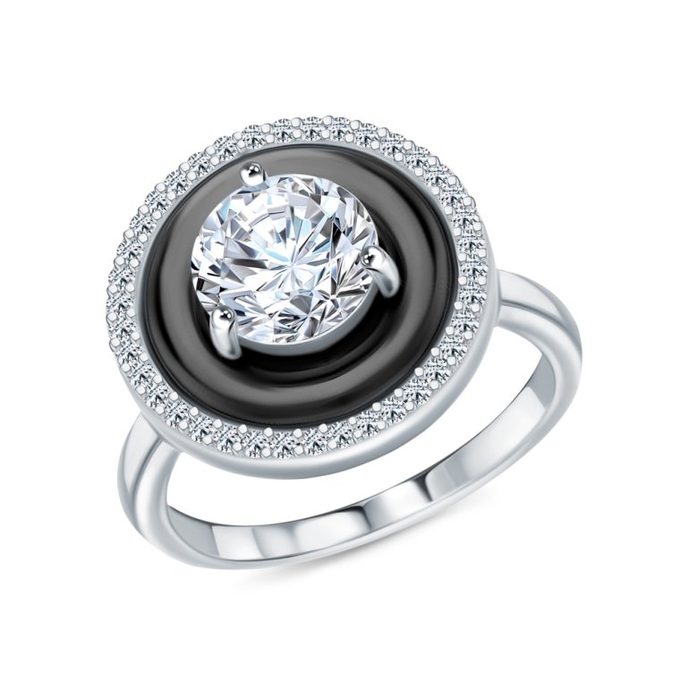 Кольцо, вставка: фианитом бесцветным;  керамика черная; Серебро 925 пробы.