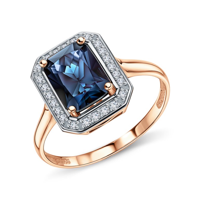 Кольцо с 1 александритом синтетическим, 1.705 карат, тип огранки Б; 24 бриллиантами, 0.098 карат, огранка круг 17 граней, цвет 2, чистота 2, тип огранки А; Розовое золото 585 пробы.
