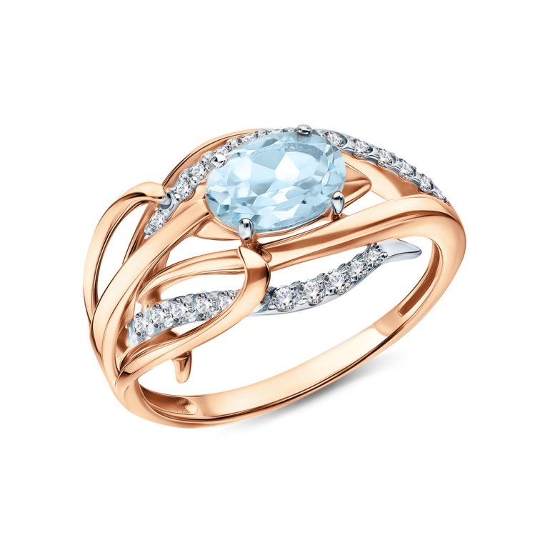 Кольцо с 1 топазом скай, 0.98 карат, тип огранки Б; 19 топазами бесцветными, 0.235 карат, тип огранки В; 5 топазами бесцветными, 0.025 карат, тип огранки В; Розовое золото 585 пробы.