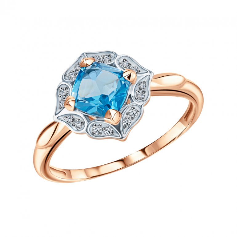 Кольцо с 16 бриллиантами природными, 0.048 карат, огранка круг 17 граней, цвет 2, чистота 2, тип огранки Б; 1 топазом свисс природным, 1.122 карат, тип огранки Б; Розовое золото 585 пробы.