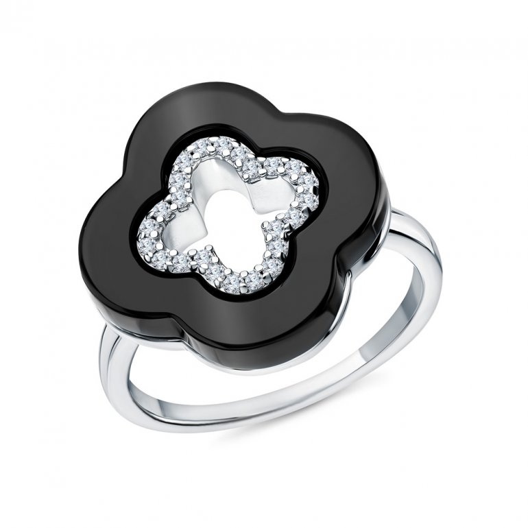 Кольцо, вставка: фианитом бесцветным;  керамика черная; Серебро 925 пробы.